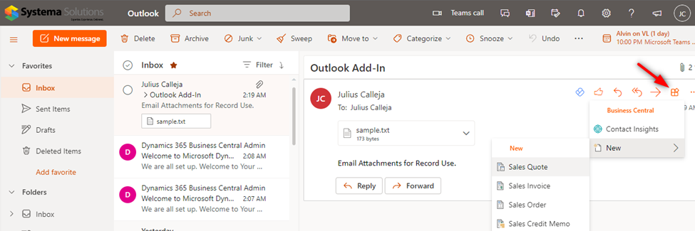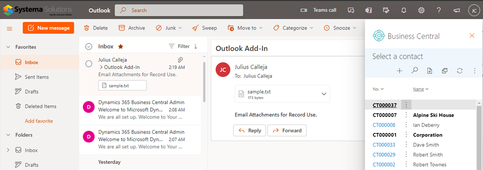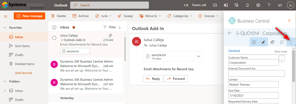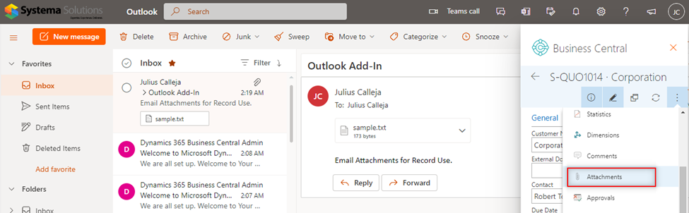 Our email inboxes are the primary source of different files that are used in creating varying documents in Business Central. The Outlook add-in now allows copying email attachments to the record displayed in the add-in.