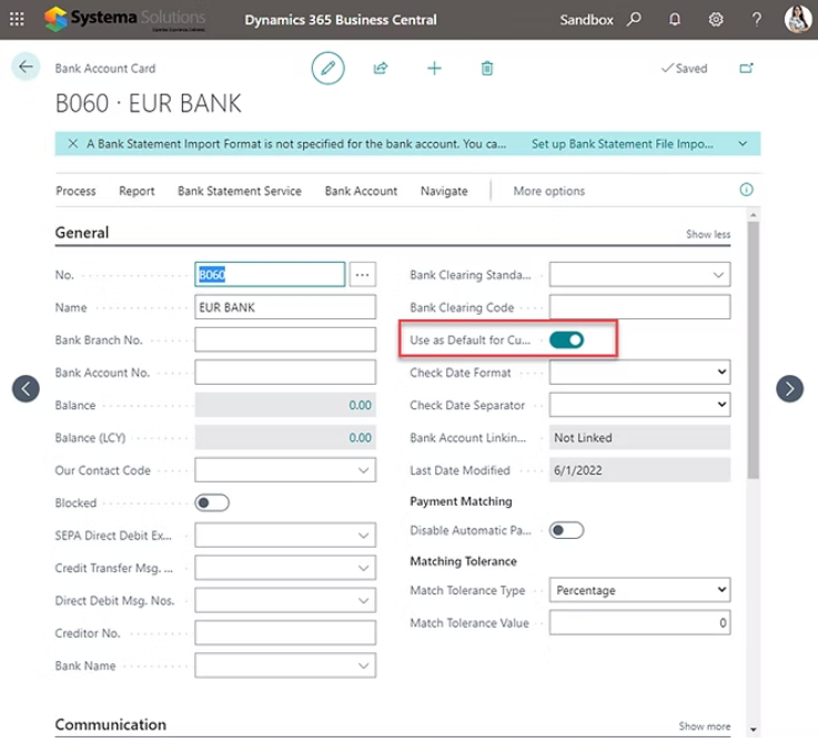 With Dynamics 365 Business Central 2022 wave 1 release, you can now set default bank accounts for companies, and for individual currencies, by choosing Use as Default for Currency on the Bank Account page.