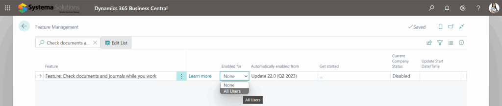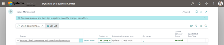 This configuration will take effect when you work on your documents. Because you enabled the Check Documents feature in the General Ledger Setup, a notification will appear on the page. Click Enable this for me.