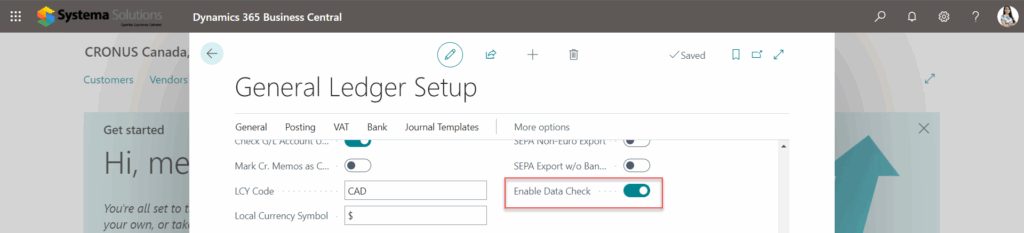 On the General Ledger Setup page, Enable the Data Check field and turn on the button to enable it.