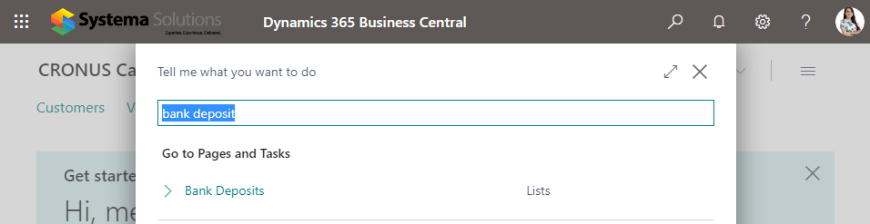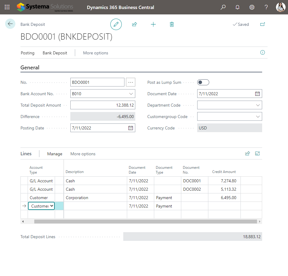Deposit lines contain information about the individual deposited items, such as checks from customers, cash sales revenue, or refunds from vendors. This information includes the document date and number, account type and number, and amount. The total amounts on the deposit lines must add up to the total amount of the deposit entered on the deposit header before posting the deposit. Here’s how to use this feature in Business Central: