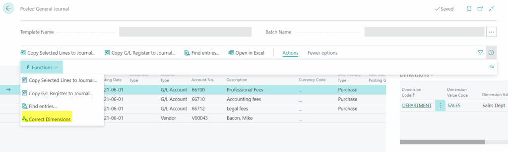 2. G/L Register. You can change the dimension per batch posting in this option. It will use “From Entry No.”, “To Entry No.” as a filter for General Ledger Entries.