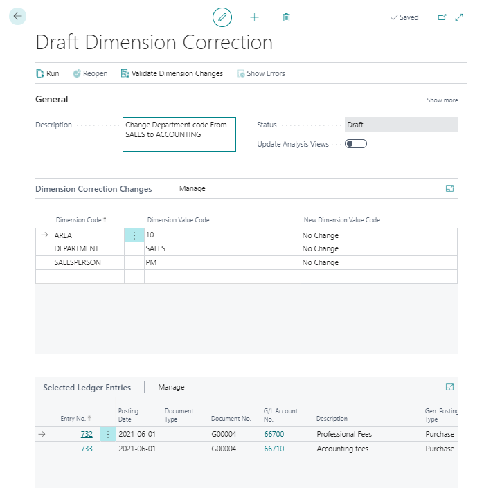 When we create a Dimension Correction, the Status is initially DRAFT. This means the G/L Entries Dimension is NOT yet updated.