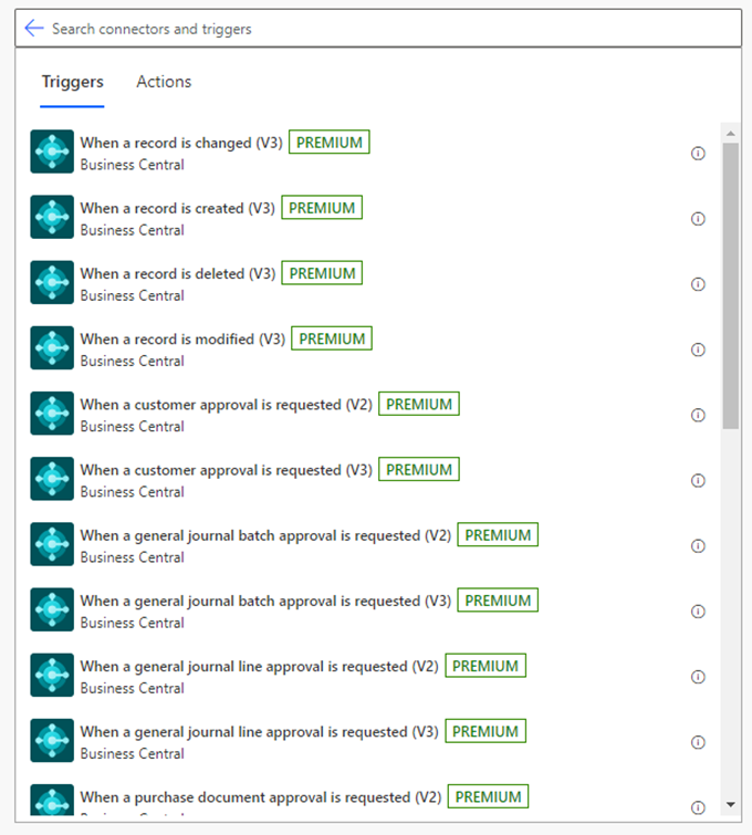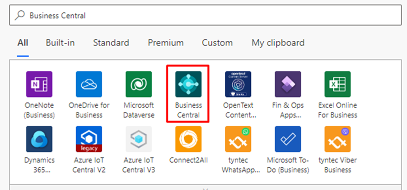 In all three cases, search for Microsoft Dynamics 365 Business Central connector and then choose the relevant trigger or template. Power Automate will prompt you to select an environment and the company within your Business Central tenant, plus any conditions in your data that you want to use it for.