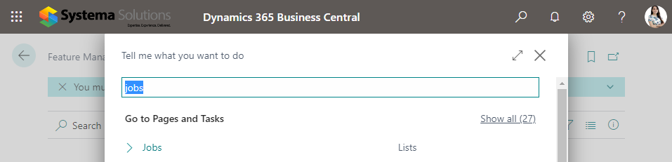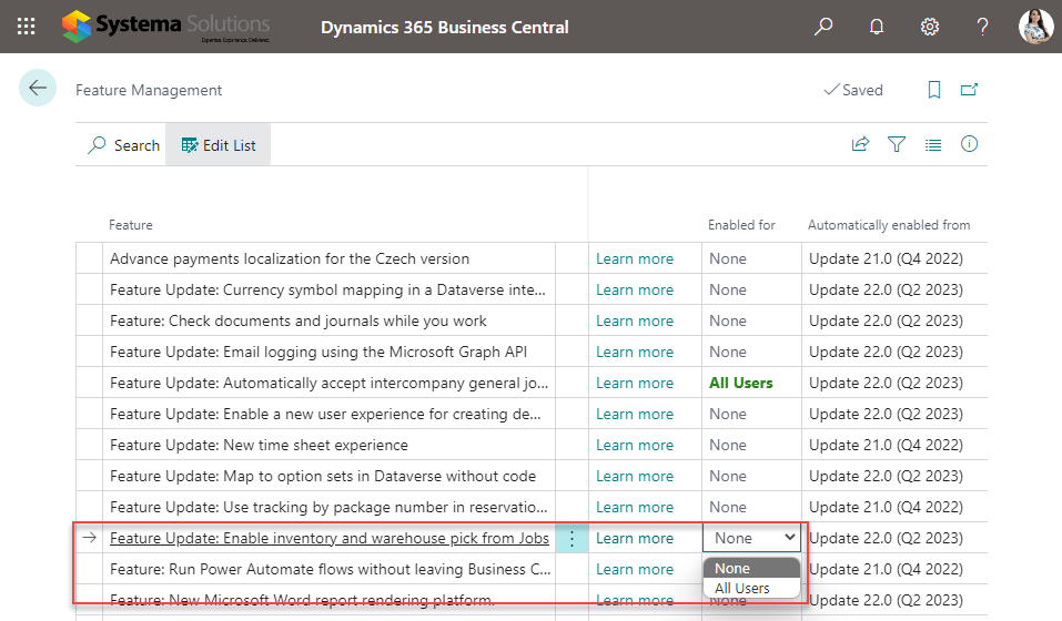 Click on Feature Management to see the list of all available for All Users. Click on Enable inventory and warehouse pick from Jobs.