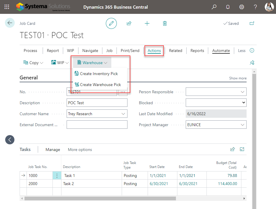 In the Actions menu, notice Create Inventory Pick and Create Warehouse Pick actions are now available.