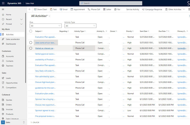 Sales professionals can create, assign, and manage activities directly within Dynamics 365 Sales. This includes setting due dates, assigning tasks to team members, tracking progress, and updating activity statuses.