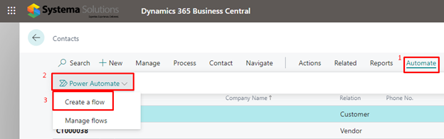 Once the admin has connected Business Central with Power Automate, you’ll see any flows your organization has added when you choose the Automate action in the relevant pages. You run the flows without leaving Business Central.