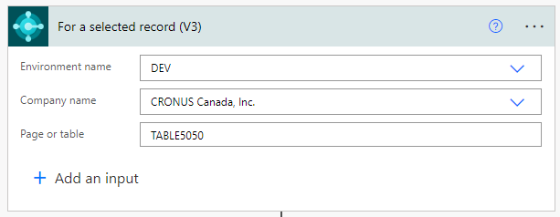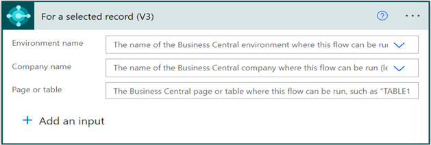 You can limit the flow to a specific environment or company but leave the Environment name and Company name fields blank to make the flow available in all environments or companies. The Page or table field specifies where you want to make the flow available from inside Business Central. For example, to add the new flow to the Automate menu on the Contact Card page in the DEV environment, set the Page or table field to TABLE5050 or PAGE5052.